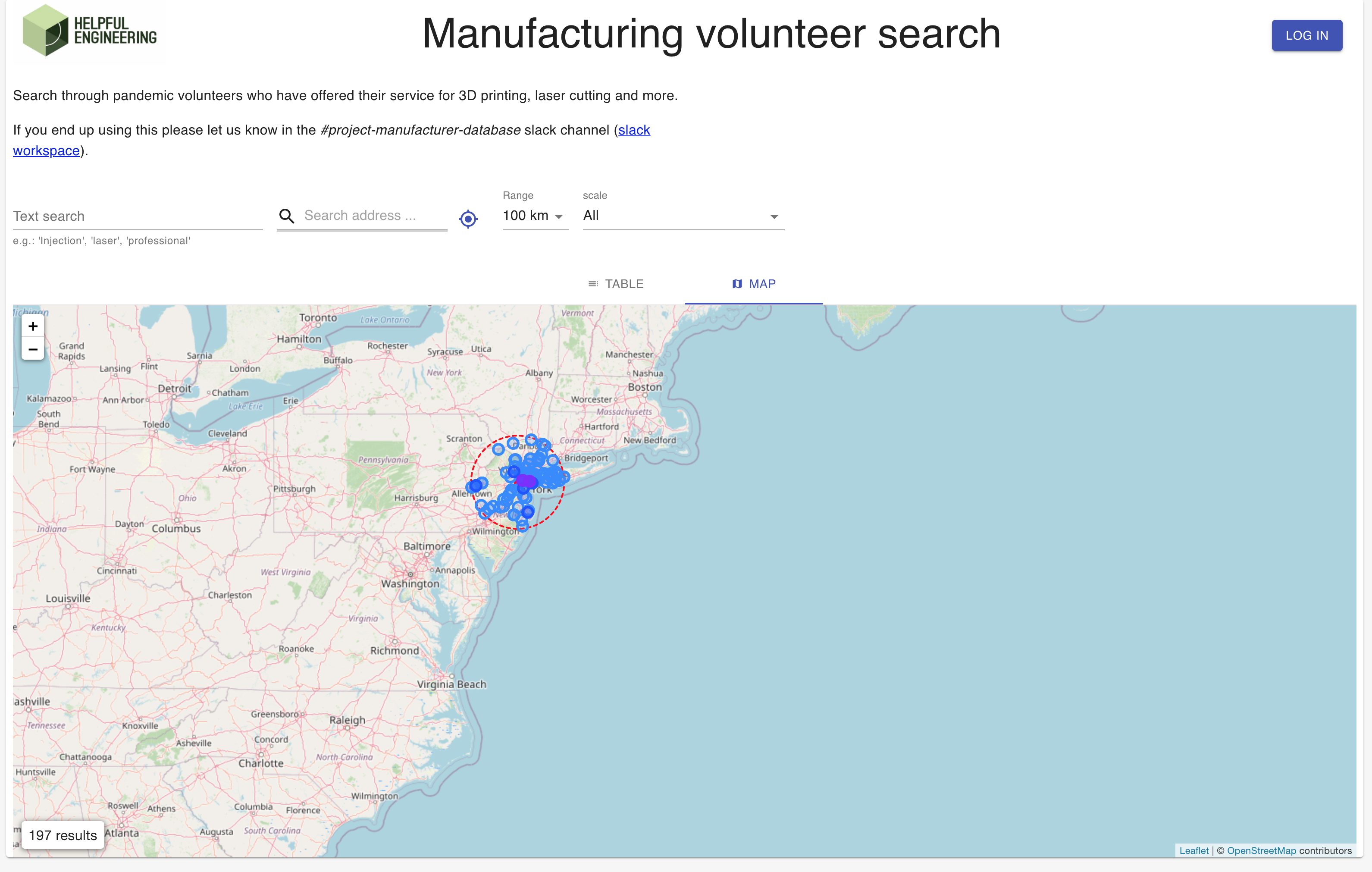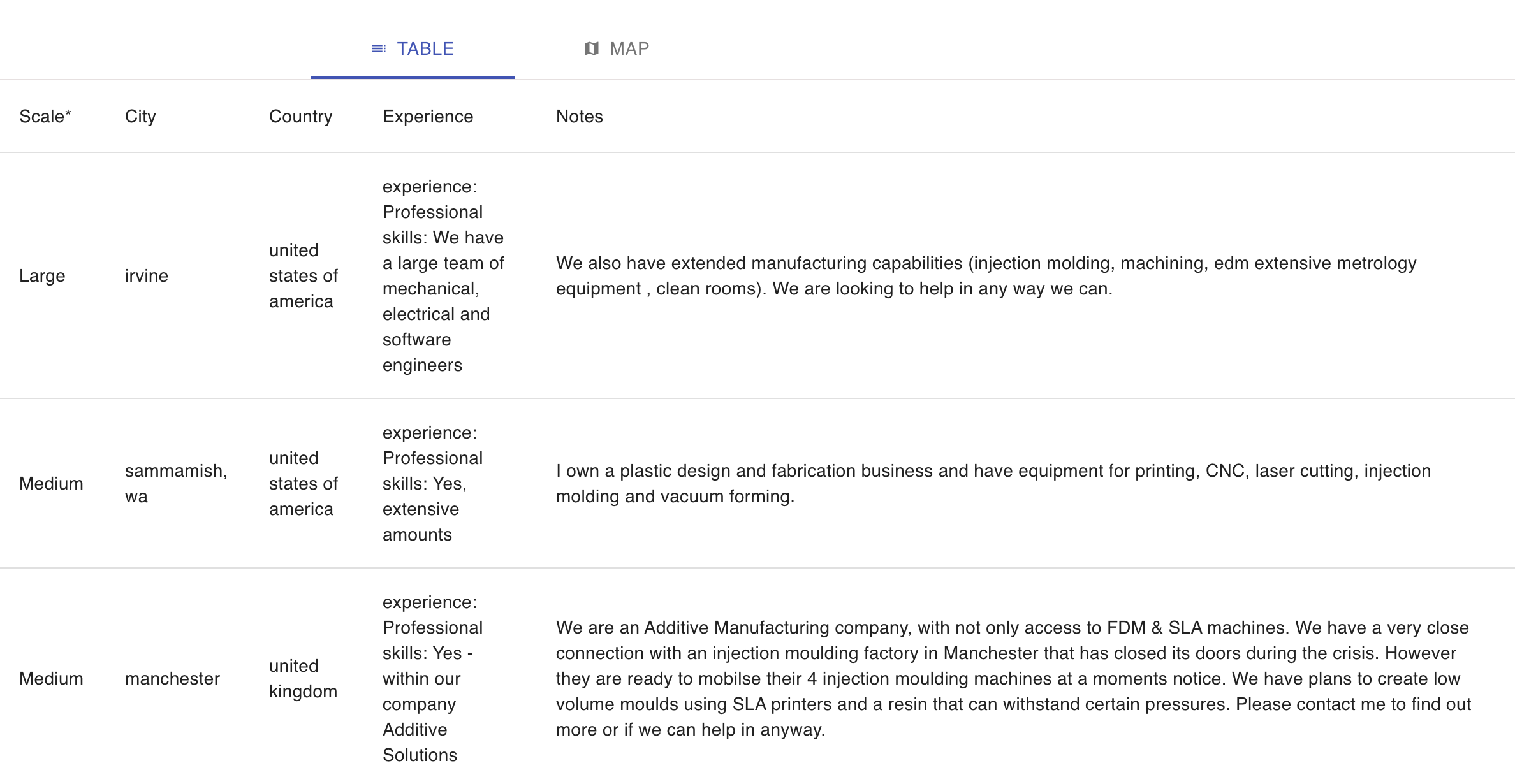 In this project we've made a web app and database to search volunteer manufacturers during the coronavirus crisis. The app lists volunteers who can help manufacture solutions using their skills and machines. The volunteers range from individuals with a 3D printer to large-scale companies with advanced capabilities.