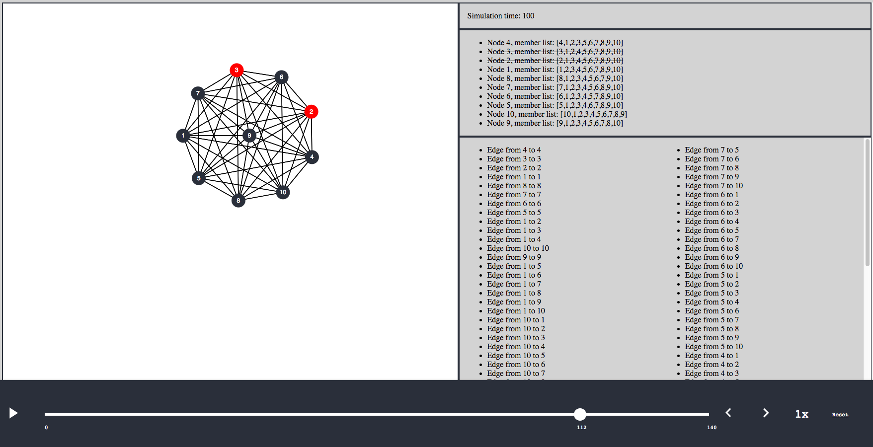The visualization uses the log output of a network gossip protocol program created in the Coursera course: Cloud Computing Concepts. The log file is parsed and Graph representation is created in a Redux state store. This state is used to construct a graph in D3. Because the graph is constructed from the Redux state at distinct events the graph can be inspected using the "time travel" scrubber.